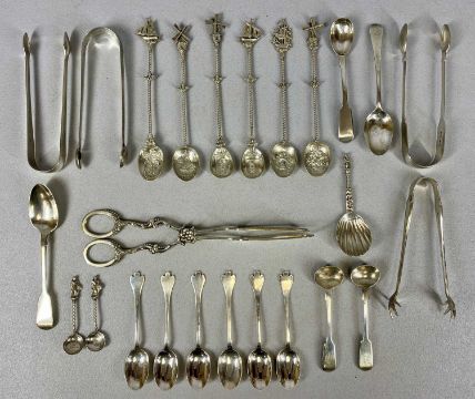 SILVER/WHITE METAL GROUP, including sugar tongs, cake servers, teaspoons, mustard spoons etc. George III & later, approx 14oz (gross)Provenance: private collection Gwynedd