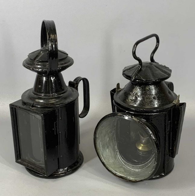 TWO VINTAGE STEEL RAILWAY SIGNAL LAMPS, unnamed, with burners 32cms and 29cms (h)Provenance: private collection Conwy
