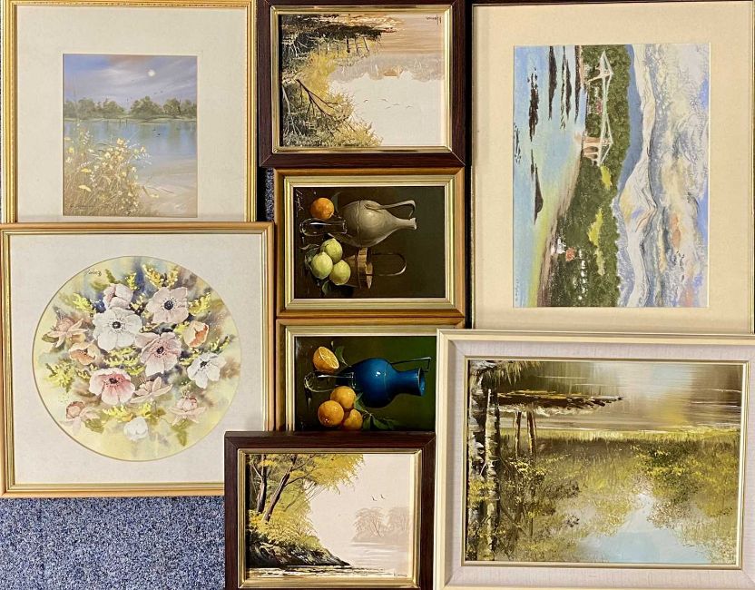 VARIOUS ARTISTS/MEDIUMS mixed group of pictures - V A HOPKINS '94 pastel - Menai Straits, signed and dated lower right, 28 x 38cms, EILEEN COOPER circular watercolour - still life of flowers, 30cms, KAY HAMMOND acrylic oils, a pair - lake views, signed lower right, 19 x 24cms, UNKNOWN acrylic oils, a pair - still lives, 22.5 x 16.5cms, UNKNOWN acrylic oil - lake view, 29 x 38cms, ETCProvenance: private collection GwyneddComments: watercolours frame and glazed, oils framed
