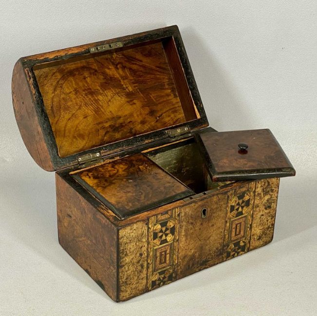 MIXED GROUP OF COLLECTABLES, including a Victorian walnut double tea caddy, parquetry inlaid, hinged domed cover, fitted interior, 23cms (w), a sycamore butter stamp, strawberries and leaf pattern, 12.5cms (diam.), a carved treen nutcracker with squirrel finial, 22cms (l), twelve volumes Dickens, Odhams Press Limited and other itemsProvenance: private collection Denbighshire