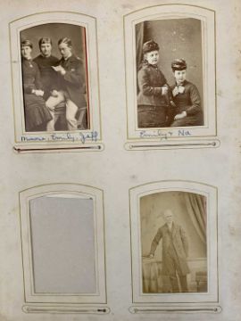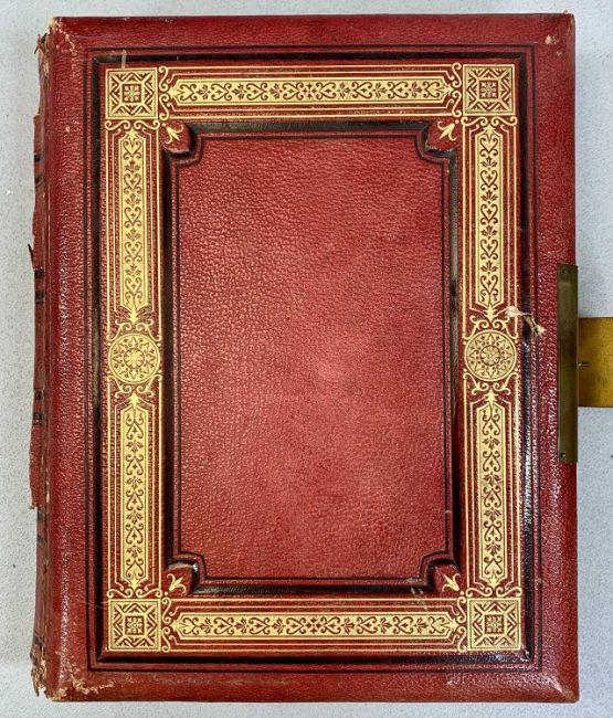 MIXED GROUP OF COLLECTABLES including 19th century tooled leather musical photograph album, containing portraits, a large tooled leather and gilt metal bound family bible, oval inlaid tea tray with gilded metal gallery, brass inlaid hardwood two handled tea tray and other itemsProvenance: private collection Conwy