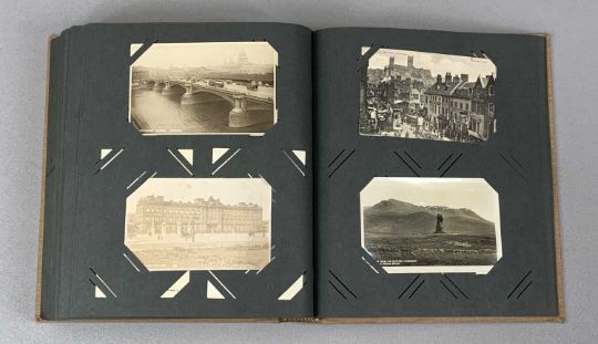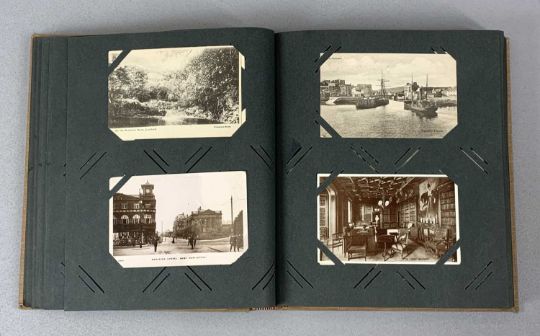 MIXED GROUP OF ITEMS including an album of antique and vintage postcards, approx. 300, vintage cigarette cards contained in a box, walnut dome-top double tea caddy and other itemsProvenance: private collection Conwy