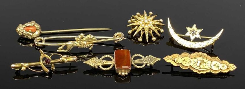GROUP OF SEVEN GOLD/GOLD TONE BROOCHES, set with cornelian, coral, seed pearl and othersProvenance: private collection Denbighshire