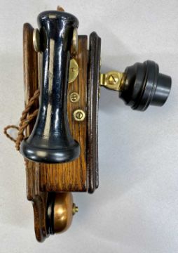 VINTAGE OAK CASED SIGNAL BOX RINGING WALL TELEPHONE, with oxidised copper bell, Bakelite mouth and ear pieces, 30.5cms (h)Provenance: private collection Conwy