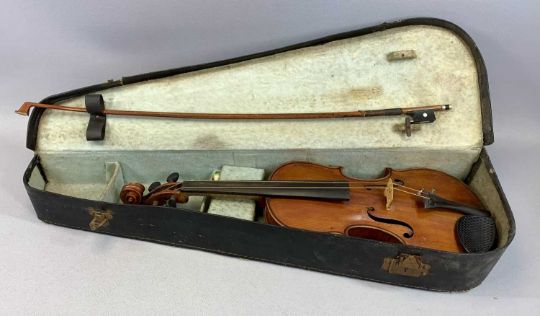 MUSICAL INSTRUMENTS, a Royal Piano Harp, sold by The Oxford Academy of Music, 50 x 40cms, in box with instructions and a violin, 37cms (l), two-piece back, in case with bowProvenance: private collection Conwy