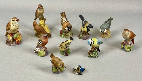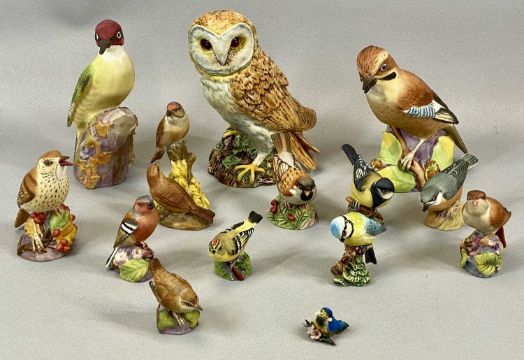 MIXED GROUP OF CHINA BIRD FIGURES including Beswick barn owl model 1046, 20cms (h), Royal Worcester jay model 3248, 16cms (h), Royal Worcester green woodpecker model 3248, 18cms (h) and eleven other smallerProvenance: deceased estate Conwy