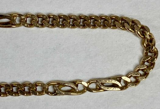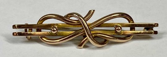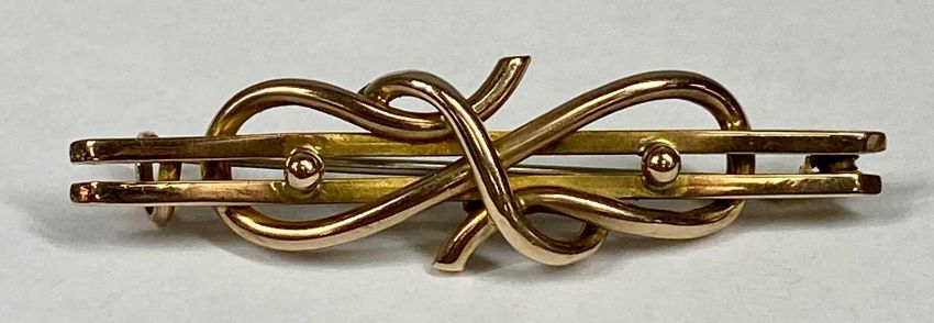 GOLD JEWELLERY, 9ct gold flat link curb necklace, 41cms (l) and 9ct rose gold knot brooch, 9gms (gross)Provenance: private collection Gwynedd