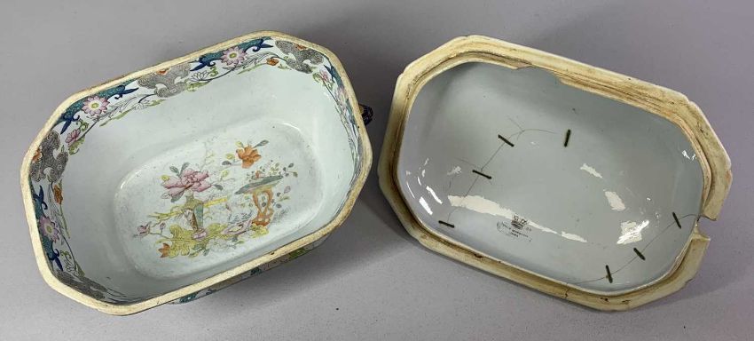 GROUP OF MIXED CERAMICS, 18th century and later, including Chinese Famille Verte circular dish with scalloped rim, enamel decoration basket of flowers to the centre, 39.5cms (diam.), Chinese Export "Tobacco Leaf" pattern oval platter, 24.5 x 31.5cms, Chinese Canton Famille Rose circular plates a pair, 19.5cms (diam.), ironstone oval lidded tureen and matching indented meat plate, 37 x 47cms, another ironstone oval meat plate, 38 x 40cms, a large circular Italian cream glazed platter, 51.5cms (diam.) and other meat platesProvenance: private collection Scotland