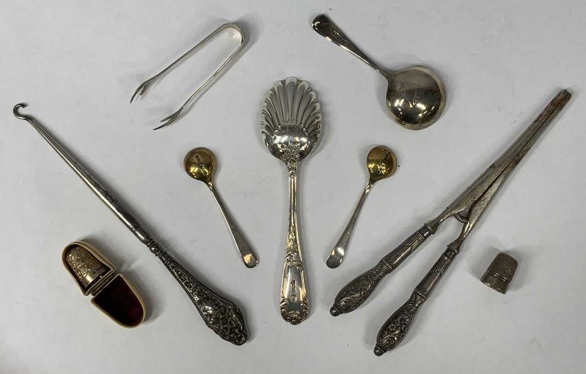 GROUP OF SMALL SILVER ITEMS including silver handled glove stretchers and button hook, a Victorian spoon, shell embossed bowl, Sheffield 1898, John Pound & Sons Ltd, silver thimble in case, white metal thimble, pair of mustard spoons with gilded bowls etc.Provenance: deceased estate Denbighshire