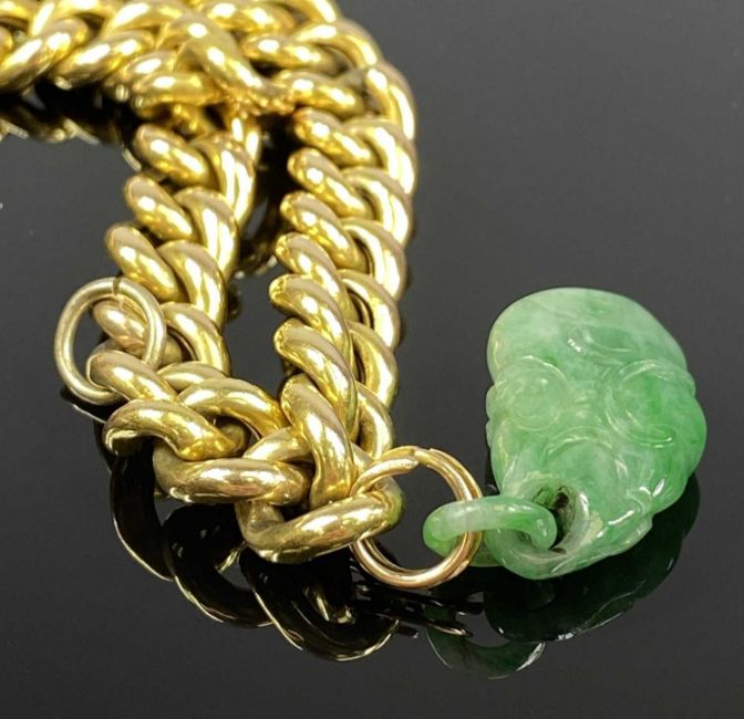 GOLD CURB LINK BRACELET, with heart shaped padlock marked 15ct, with a jade type charm attached, 29gms (gross)Provenance: private collection Conwy