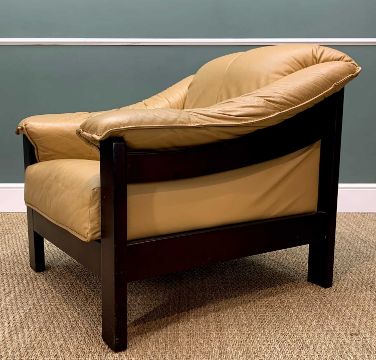 PAIR OF LEATHER LOUNGE CHAIRS, solid wood frames, caramel leather upholstery, 80 (h) x 90 (w) x 87cms (d) (2)Provenance: ex Maskrey's furniture store Cardiff, private collectionComments: normal used condition, no issues