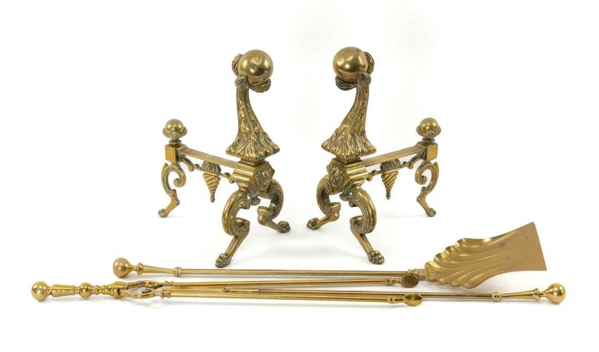 PAIR 19TH CENTURY BRASS CHENETS, modelled as hairy claw and ball feet, on bowed legs, 36cms (h), together with set three brass fire irons (5)Provenance: deceased estate Pembrokeshire Comments: wear and tear commensurate with use