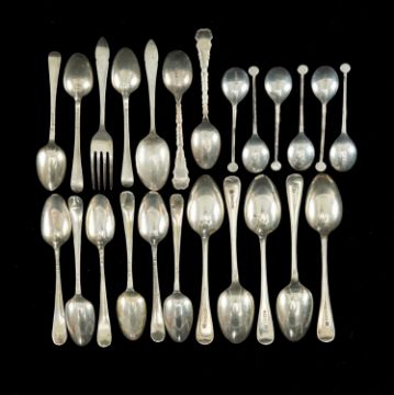 MIXED SETS 19/20TH C. SILVER TEA/COFFEE SPOONS, including Joseph Smith II, London c. 1815, set six Old English feather edge spoons; Henry Wilkinson & Co, Sheffield 1883, set five Old English spoons with monogrammed handles; set six small coffee spoons and set three bright-cut coffee spoons, Chistening spoon and fork, pair others, tot wt 10.5ozt (24)Provenance: private collection Lampeter