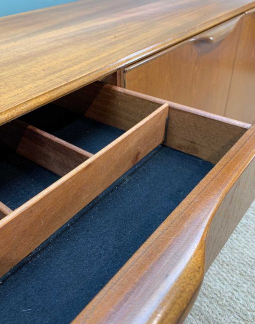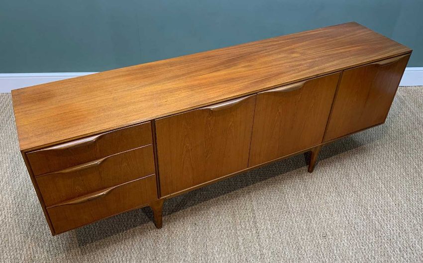 TOM ROBERTSON FOR McINTOSH MID-CENTURY 'DUNVEGAN' TEAK SIDEBOARD, central cupboard with two doors, internal shaped shelf, flanked by drawers to the left, upper with cutlery tidy, fall-front door to the right with pull-out melamime topped serving tray and fitted six-bottle tidy, 75.5 (h) x 202 (w) x 45cms (d)Provenance: private collection West WalesComments: no condition issues
