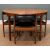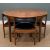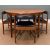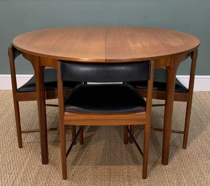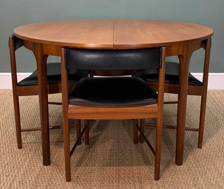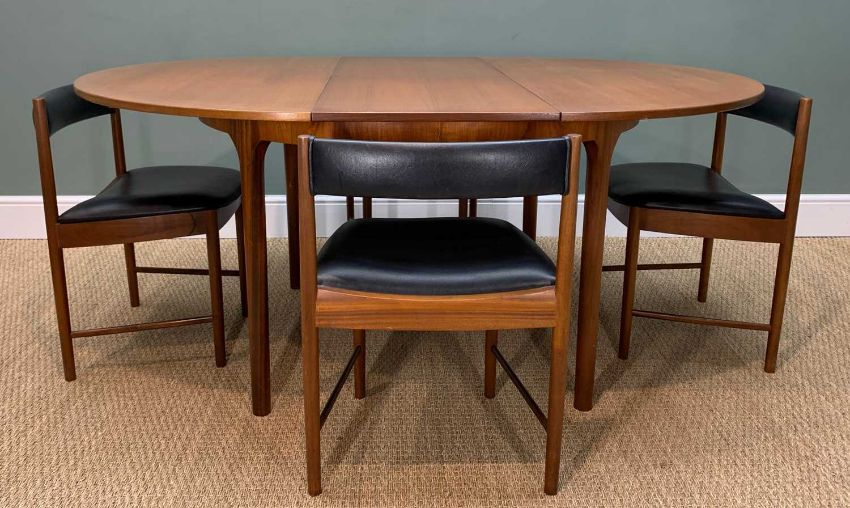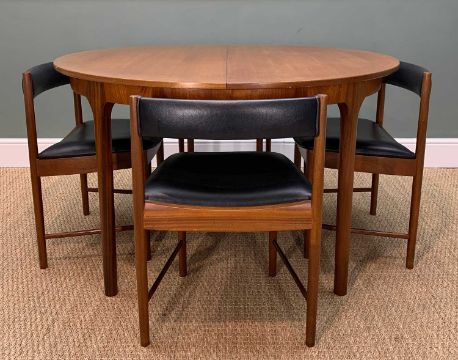 MID-CENTURY McINTOSH 'DUNVEGAN' TEAK EXTENDING DINING TABLE AND CHAIRS, circular top, concealed hinged leaf below, complete with four matching 'tuck under' chairs upholstered in black leatherette, 75 (h) x 122 (dia.) 168cms extended, (5)Provenance: private collection West WalesComments: minor fading otherwise no condition issues