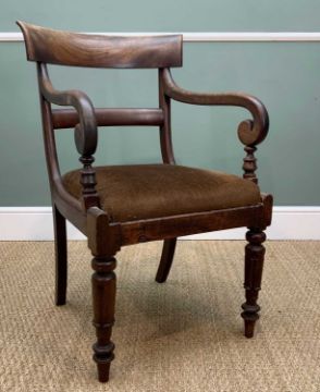 GEORGE III MAHOGANY TRIPOD TABLE & REGENCY ARMCHAIR, the table with original one-piece mahogany tilt action top, on gun barrel support and slender cabriole legs, 68.5cms diam.; the chair with scrolled arms, drop-in seat and foliate capped tapering circular legs, 56cms (w) (2)Provenace: private collection PenarthComments: table- small cracks, top loose, fading; chair- frame slightly loose.