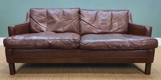 MID-CENTURY DANISH TWO SEATER SOFA, chocolate brown cowhide leather, 70 (h) x 150 (w) x 80cms (d), cushion height 37cmsProvenance: private collection Cardiff, purchased by the vendor from Top Stak, LlandowComments: ordinary used condition