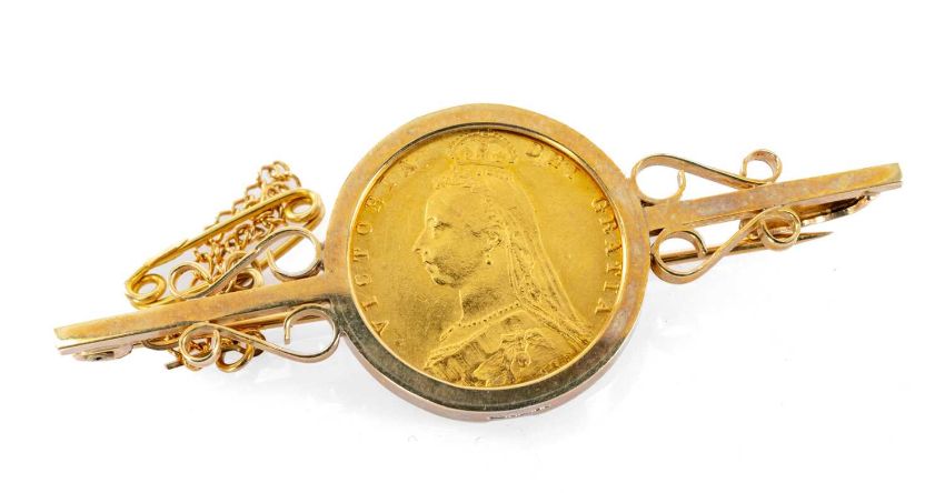 VICTORIAN GOLD HALF SOVEREIGN, 1887, Jubilee head, in 9ct gold brooch mount, 7.5gmsProvenance: deceased estate CarmarthenshireComments: good overall, light wear commensurate with age, viewing recommended