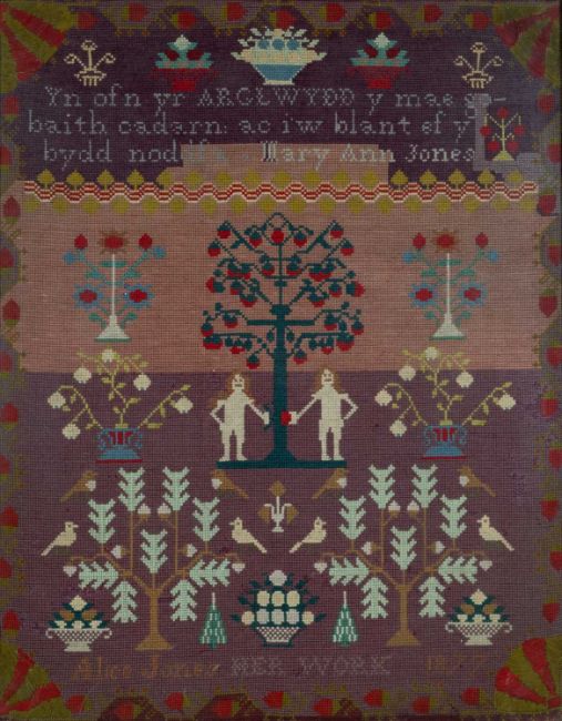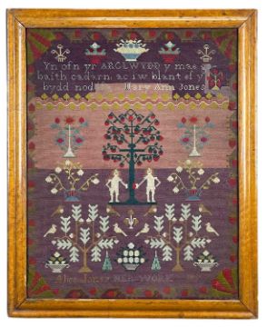 VICTORIAN WELSH LANGUAGE WOOLWORK SAMPLER worked by Alice Jones, dated 1877, Welsh language version of Proverb 14:26 translated by William Morgan 'Yn ofn yr Arglwydd y mae gobaith cadarn: ac i'w blant ef y bydd noddfa' (In the fear of the Lord one has strong confidence, and his children will have a refuge) with Adam and Eve beside apple tree and additional trees, birds and flowers, 76 x 61cms (incl. frame)Provenance: the Welsh art collection of award-winning television producer, the late Pat Llewellyn (1962-2017), by descentComments: framed and glazed