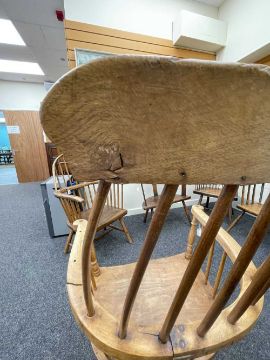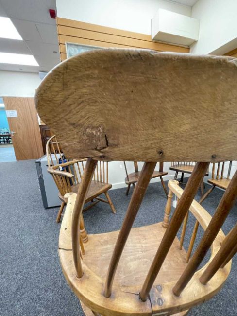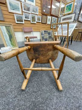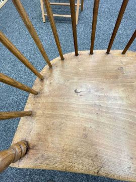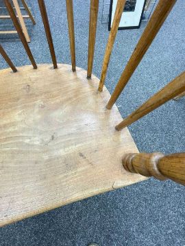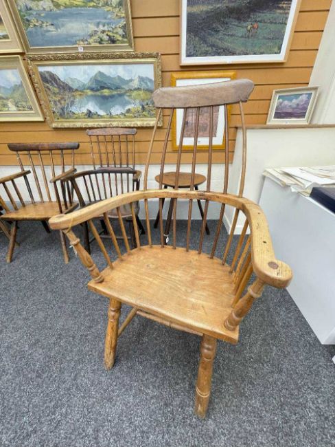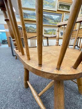 WELSH ELM AND ASH ARMCHAIR c. 1800, probably Swansea Valley, of 'lobster-pot' form, the back of seven tapering spindles, gently drawn-in and secured by a slightly curved cresting rail, the angular arm bow with splayed rounded-ends above further side spindles and turned uprights, the elm saddle-seat with flat front, on turned legs joined by H-stretcher, 65 (w) x 61 (d) x 114cms (h) Provenance: the Welsh art collection of award-winning television producer, the late Pat Llewellyn (1962-2017)Comments: Underside of seat inscribed in ink "This chair resided in the waiting room of DTM Jones Solicitors, 18 Market Sq., Landovery until 1960. 'There were so many chairs it became a social meeting place' ". Seat with metal strap repairs, bowed arms with old repairs and damage, spindle joint to cresting rail chipped.