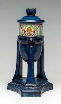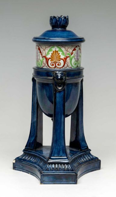RARE SWANSEA CAMBRIAN PEARLWARE CASSOLETTE circa 1806, elevated by three tall tapering square legs with moulded lion's masks, over concave triangular base, finely painted below the rim with a band of polychrome acanthus, anthemion and seaweed ornament, reserved on blue ground, reversible candle holder/cover, 28.8-31.5cms (h)Provenance: deceased estate Newport.Auctioneer's Notes: Cf. Jonathan Gray, The Cambrian Company, p. 151, pl. 6.16. and p. 128 pl. 5.26, and E. Morton Nance, The Pottery & Porcelain of Swansea & Nantgarw, (XVII), and Sothebys 14-16.5.92, Sir Leslie Joseph Collection, lot 782 where the decoration is attributed to Thomas Pardoe.Comments: small chips to foot, nibbles to floral knop, crack to candle nozzle.