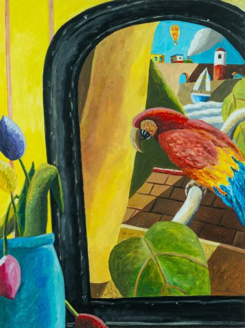 ‡ EMRYS WILLIAMS (Welsh b. 1958) acrylic on panel - entitled verso, 'Parrot and Mirror' on Underground Gallery label, inscribed and dated verso 1998, 60 x 45cmsProvenance: private collection PowysComments: framed and glazed, ready to hang