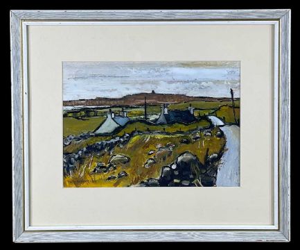 ‡ WILF ROBERTS (Welsh 1941-2016) acrylic on paper - Ynys Mon (Anglesey) landscape with rooftops and Parys Mountain beyond, signed and dated 1997, 19 x 27cmsProvenance: private collectionComments: framed and glazed, ready to hang