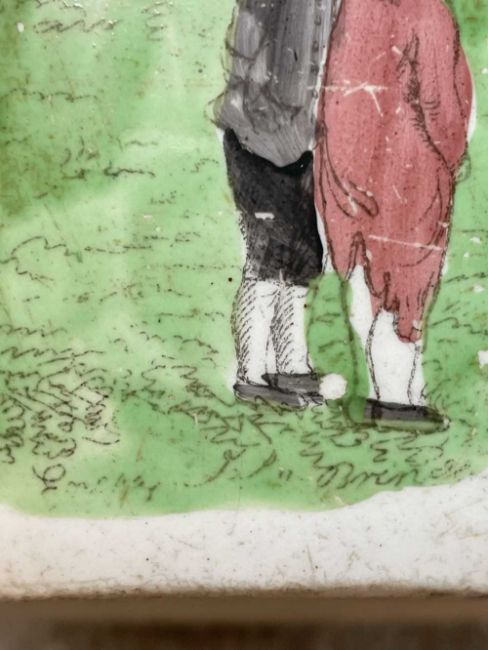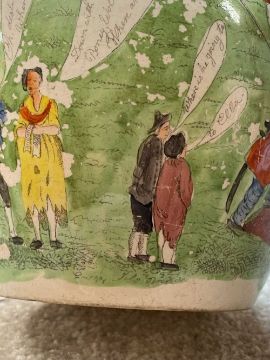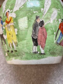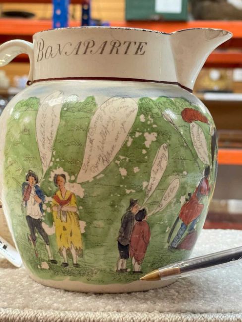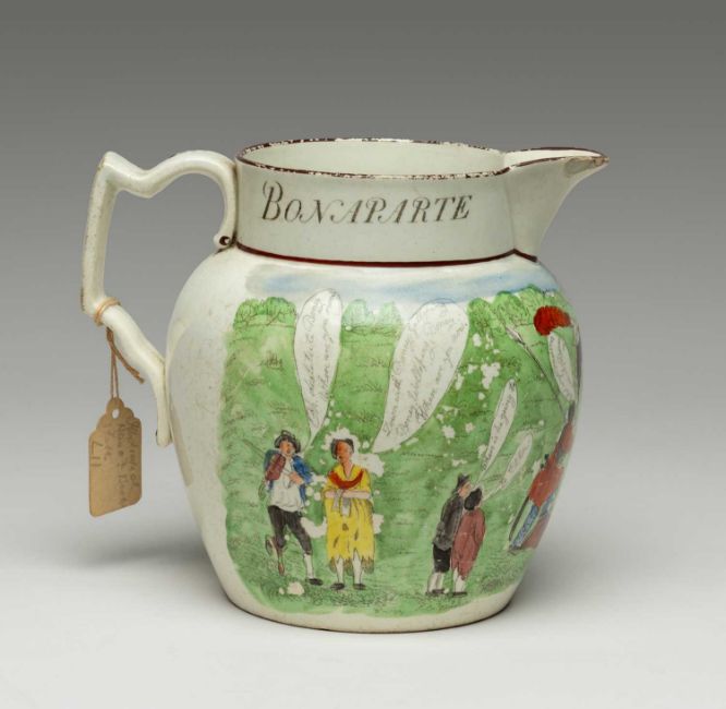 SWANSEA CAMBRIAN POTTERY NAPOLEON JUG circa 1815, printed and coloured with caricatures with speech bubbles, beneath legend at neck "Bonaparte Dethron'd April 1st 1814", signed in the print 'engraved J. Brindley', 14cms (h)Provenance: deceased estate NewportAuctioneer's Note: the Allies entered Paris on 31st March 1814 and whilst Napoleon did not abdicate until 6th April, clearly potters could not resist the temptation of declaring April Fool's Day that of his downfall. Cf. David Drakard, Printed English Pottery, pls. 712a, b and c.; also Helen Hallesy, Swansea Commemorative Pottery, p. 120, pl. 12.3b.Comments: chips and wear on rim and spout