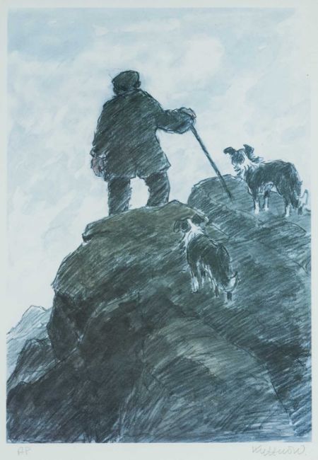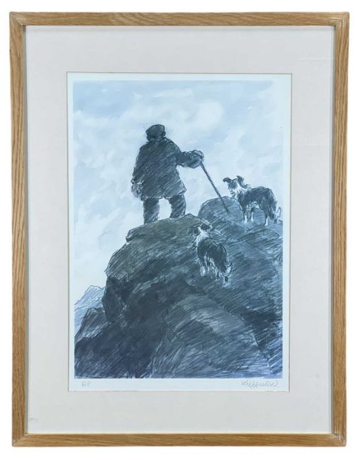 ‡ SIR KYFFIN WILLIAMS RA artist's proof print - shepherd on mountainside with two sheepdogs, fully signed, 51 x 36cmsProvenance: private collection DenbighshireComments: framed and glazed, ready to hang