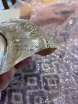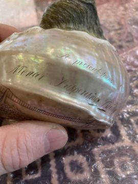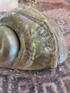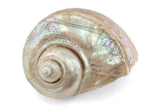 RARE WELSH SCRIMSHAW PEARLY TURBAN SHELL SOUVENIR mid-19th Century, relating to Ynys Mon (Anglesey) history, engineering and civil engineer Thomas Telford (1757-1834), the commemorative shell engraved with a profile of the bridge over the Menai Straits engineered by Telford and which crosses from mainland Wales to the Isle of Anglesey (Ynys Mon in Welsh), the bridge celebrates its bicentennial anniversary of completion in 2026, the shell inscribed 'A Present from Menai Suspension Bridge' and measurements for total length, height, length of chain and weight, also with the name 'Glasynys' (translation being Blue Isle) which may relate to the Welsh writer Owen Wynne Jones (1828-1870) who's bardic name was Glasynys, 11cms wideProvenance: private collection GwyneddComments: very sl. losses to edges