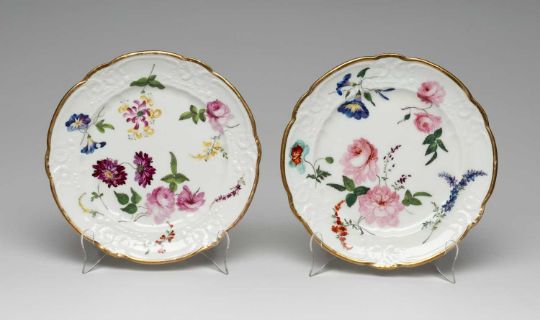 PAIR OF NANTGARW PORCELAIN DESSERT PLATES circa 1813-1820, each painted with full blown roses and wild summer flowers, C-scroll moulded border and gilt band rim, impressed marks, 21.7cms (diam) (2)Provenance: private collection BristolComments: gilt partially rubbed, one with small rim chip, other with ground foot-ring and chip to foot-ring, worn glaze underneath.