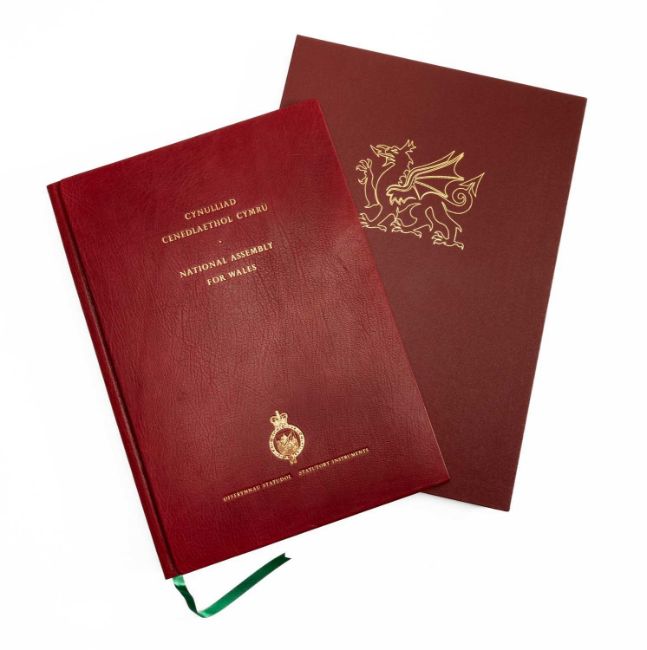 GWASG GREGYNOG PRESS: NATIONAL ASSEMBLY FOR WALES FACSIMILE-SPECIAL Gregynog commissioned souvenir limited edition (11/16) of the 'Statutory Instrument of the National Assembly for Wales', presented to the assembly by the Law Society 27th June 2000, hand bound in red full cloth, blocked in gold and presented in a drop-back outer, signed by printer and binders David Vickers, Alan Wood and Eric Franklin, with accompanying ephemeraProvenance: private collection SwanseaComments: fine condition