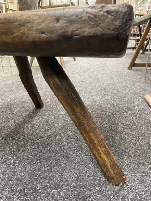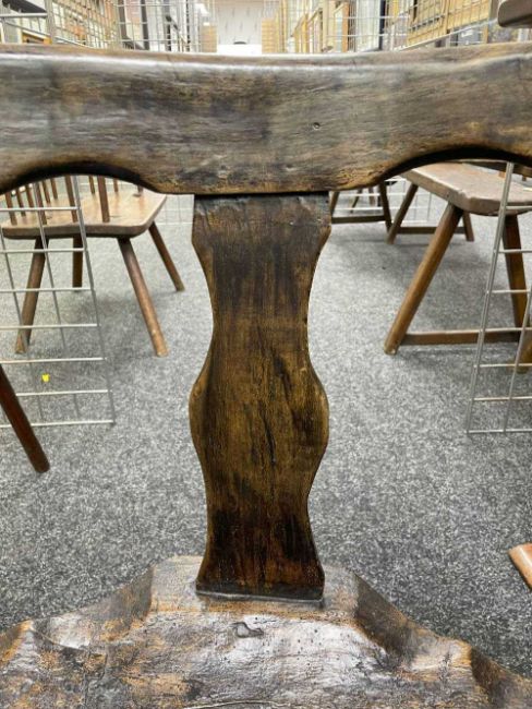WELSH ELM AND BEECH YOKE-BACK CHAIR, 18th Century, north Pembrokeshire or Cardiganshire, thick shaped seat-rail above three vase splats, thick dished seat with shaped back edge, on three hand shaped legs mortised and wedged through the seat, 70 (h) x 77 (w) x 36cms (d)Provenance: the Welsh art collection of award-winning television producer, the late Pat Llewellyn (1962-2017).Comments: generally good with wear commensurate with age, old worm holes to underseat (believed treated), later staining.