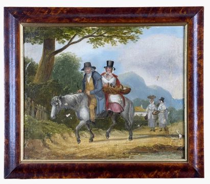 EARLY 19TH CENTURY WELSH SCHOOL MANNER OF JOHN CAMBRIAN ROWLAND oil on canvas - inscribed verso, 'Welsh Couple Going to Market', 35.5 x 43cmsProvenance: the Welsh art collection of award-winning television producer, the late Pat Llewellyn (1962-2017), by descentComments: craquelure and paint loss, framed