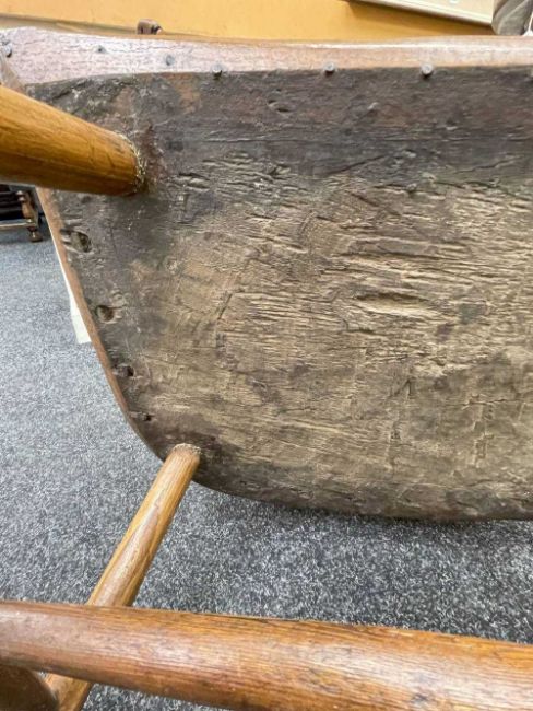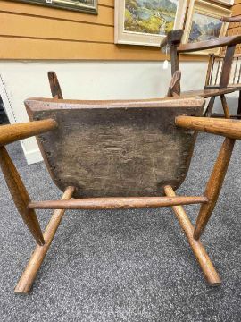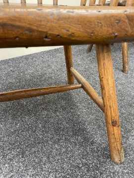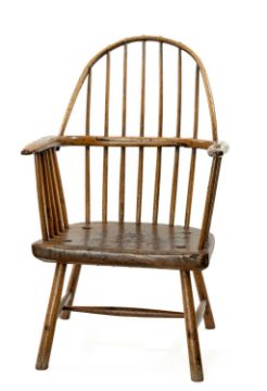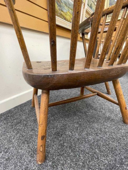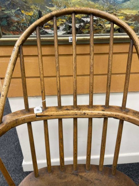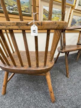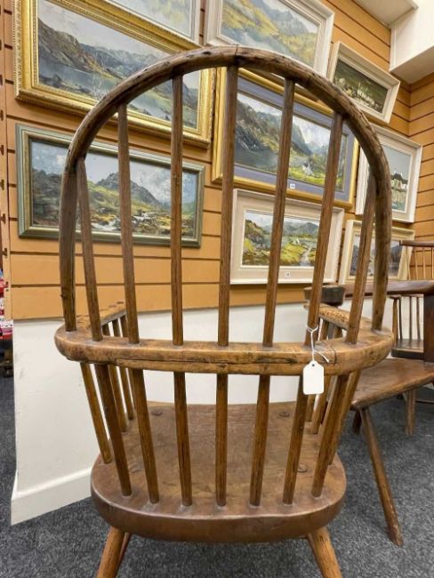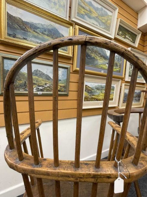 WELSH ELM & ASH STICK BACK ARMCHAIR, c.1800, probably Carmarthenshire, the arched back above seven spindles, bisecting joined arms with tapered ends and supported on ten further spindles, D-shaped seat with flat front, on slightly splayed circular section legs mortised and wedged through the seat, H-stretcher, 63 (w) x 62 (d) x 100cms (h) Provenance: the Welsh art collection of award-winning television producer, the late Pat Llewellyn (1962-2017)Comments: good overall with lovely honey gold patina