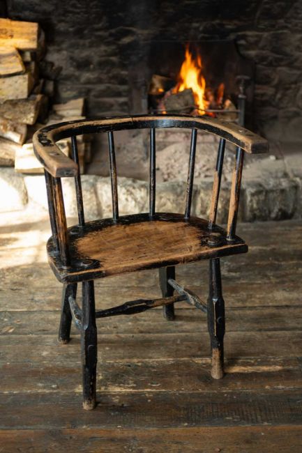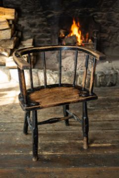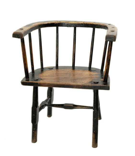 WELSH ELM AND ASH YOKE-BACK CHAIR, late 18th Century, U-shaped joined seat-rail above nine spindles, D-shaped seat with flat front, on shaped legs mortised and wedged through the seat, joined by matching H-stretcher, remains of black paint, 81 (h) x 64 (w) x 53cms (d)Provenance: the Welsh art collection of award-winning television producer, the late Pat Llewellyn (1962-2017).Comments: generally good with wear commensurate with age