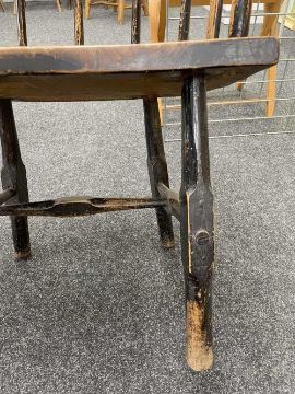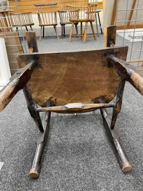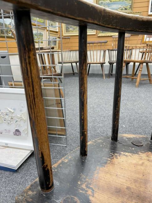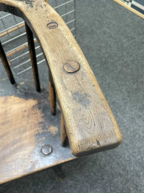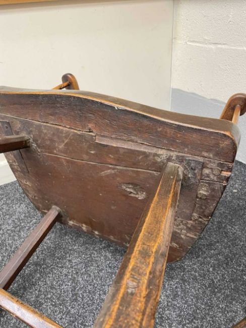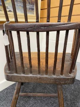 WELSH OAK & ASH COMB-BACK ARMCHAIR late 18th Century, Cardiganshire, the back of seven spindles secured by a slightly curved cresting rail, the angular arm bow above further side spindles, the seat with shaped front, on hand shaped splayed legs joined by H-stretcher, 56 (w) x 39 (d) x 99cms (h)Provenance: the Welsh art collection of award-winning television producer, the late Pat Llewellyn (1962-2017).Comments: old metal repairs above and below the seat, seat front repaired or is possibly later
