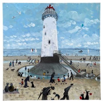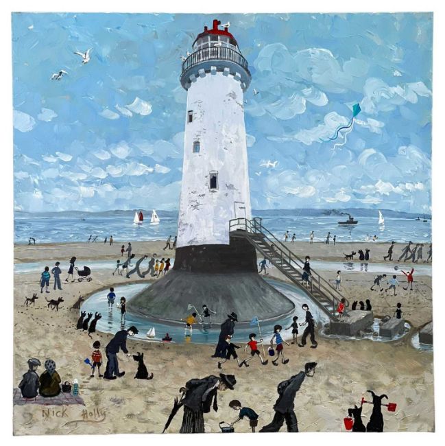 ‡ NICK HOLLY (b.1968) large oil on canvas - entitled verso, 'Talacre Lighthouse, Prestatyn, Flintshire' on Albany Gallery label, signed, 100 x 100cmsProvenance: private collection CheshireComments: framed, ready to hangDelivery: complimentary delivery can be arranged for all purchases over £4000 in this Welsh Sale auction (England and Wales only) please contact brj@rjauctions.co.uk for further details