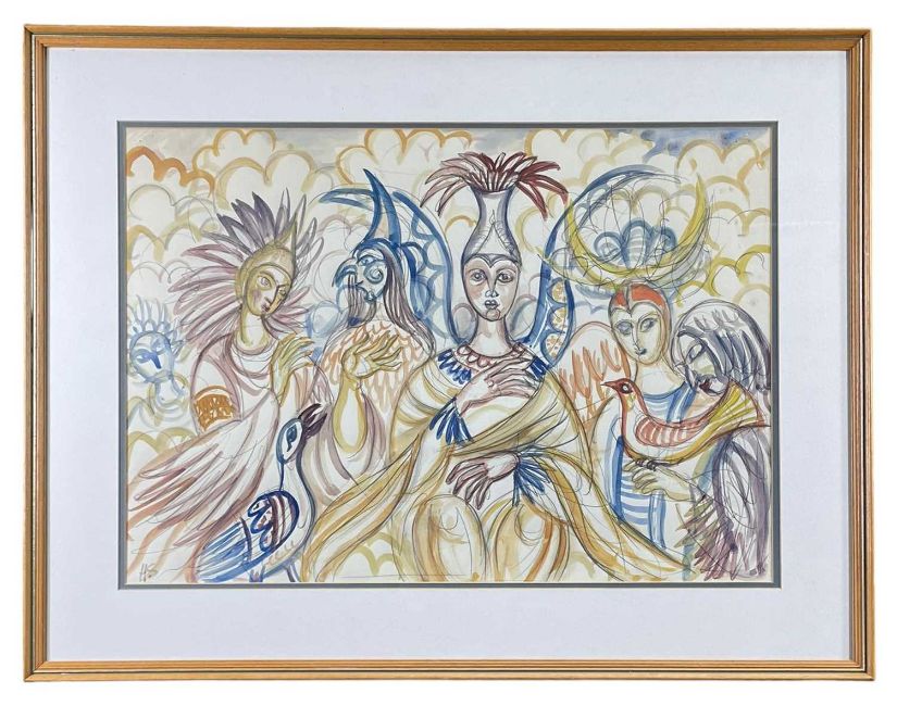 ‡ HELEN STEINTHAL (1911-1991) pencil and watercolour - entitled verso, 'Bird Worshippers', signed with initials, 40 x 58cmsProvenance: private collection West MidlandsComments: framed and glazed, ready to hang