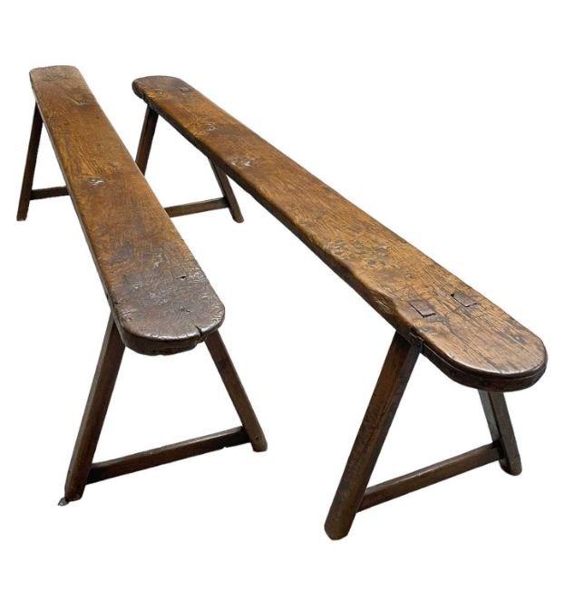 PAIR PRIMITIVE JOINED OAK LONG BENCHES, 19th Century, on A-shaped trestle end supports mortised through the seats, 187 (w) x 38 (d) x 48.5cms (h) (2)Provenance: the Welsh art collection of award-winning television producer, the late Pat Llewellyn (1962-2017).Comments: good overall patina, old wear to ends,