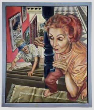 ‡ SALLY MOORE (Welsh b.1962) oil on board - entitled verso, 'Another Party' on Martin Tinney Gallery label, signed and dated verso 1992, 95 x 80cmsProvenance: private collection CardiffComments: framed, ready to hangDelivery: complimentary delivery can be arranged for all purchases over £4000 in this Welsh Sale auction (England and Wales only) please contact brj@rjauctions.co.uk for further details