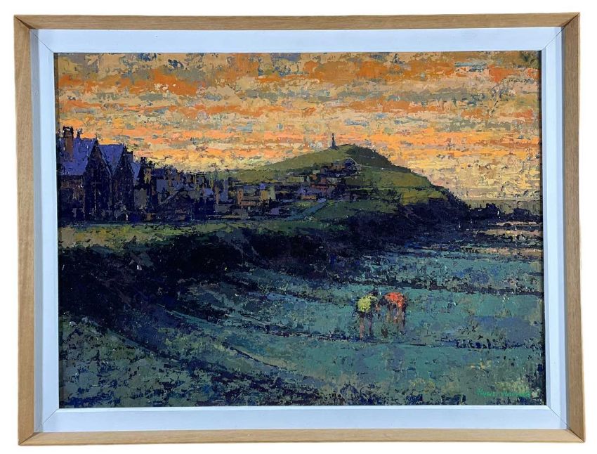 ‡ HYWEL HARRIES (1921-1990) oil on board - sunset over Borth, Ceredigion, with two beachcombers, circa 1970's, signed, 51 x 70cmsProvenance: private collection CeredigionComments: original frame, ready to hangDelivery: complimentary delivery can be arranged for all purchases over £4000 in this Welsh Sale auction (England and Wales only) please contact brj@rjauctions.co.uk for further details