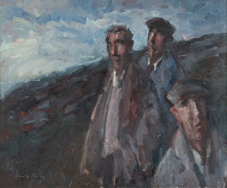 ‡ GARETH PARRY (Welsh b.1951) oil on canvas - entitled verso 'Tri Cymydog, Ar Foncyn / Three Friends on a Hillside', signed, 49 x 59cmsProvenance: private collection GwyneddComments: framed and ready to hang