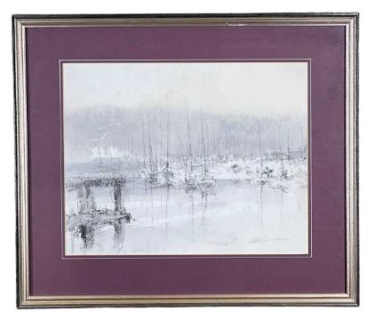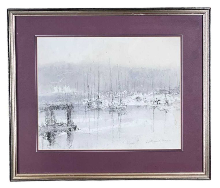 ‡ WILLIAM SELWYN (Welsh b. 1933) conté and wash - harbour view with yachts, signed in full, 30 x 39cmsProvenance: private collection ConwyComments: framed and glazed, ready to hang