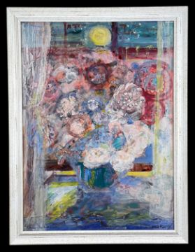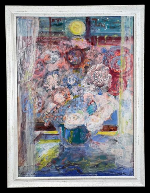 ‡ LESLIE MOORE (Welsh 1913-1976) mixed media - still life of flowers, entitled, 'Evening - The Studio', signed and dated '75, 75 x 55cmsProvenance: deceased estate Vale of GlamorganComments: framed and glazed, ready to hang