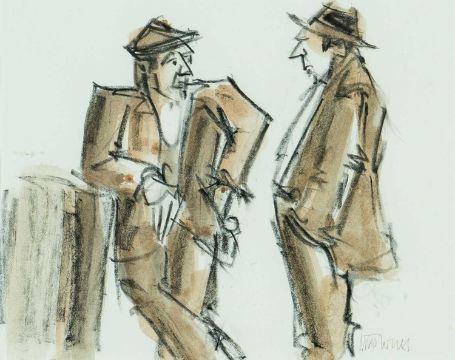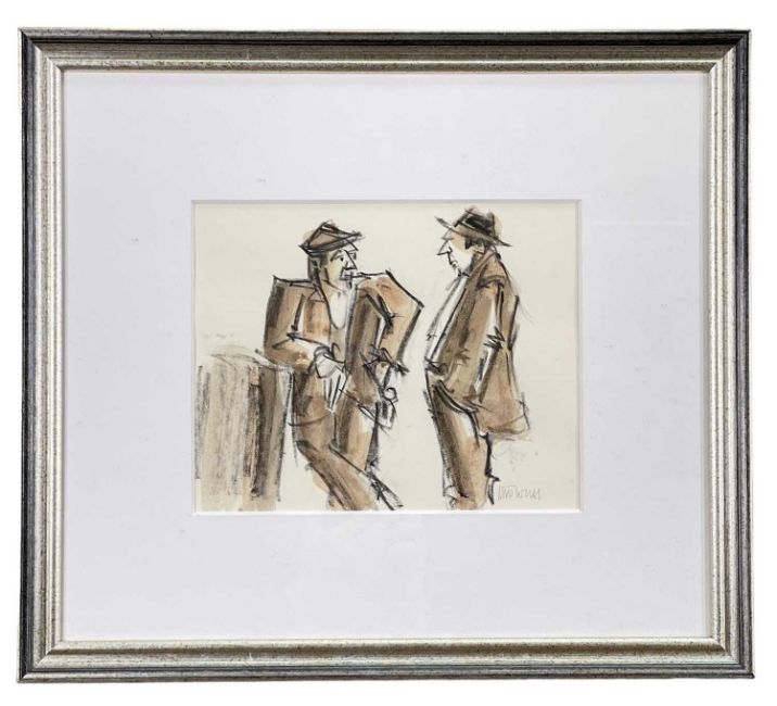 ‡ MIKE JONES (Welsh 1941-2022) crayon and wash - entitled verso, 'Farmers', signed, 20 x 26cmsProvenance: private collection CardiffComments: framed and glazed, ready to hang