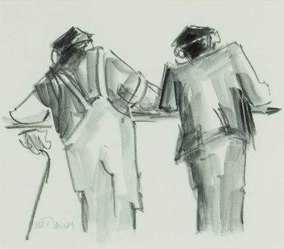 ‡ MIKE JONES (Welsh 1941-2022) inkwash on paper - entitled verso, 'Farmers on a Rail', signed, 23 x 27cmsProvenance: private collection DenbighshireComments: framed and glazed, ready to hang