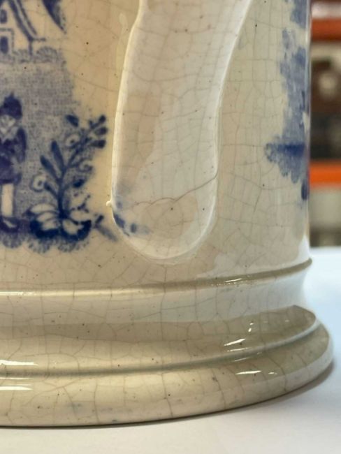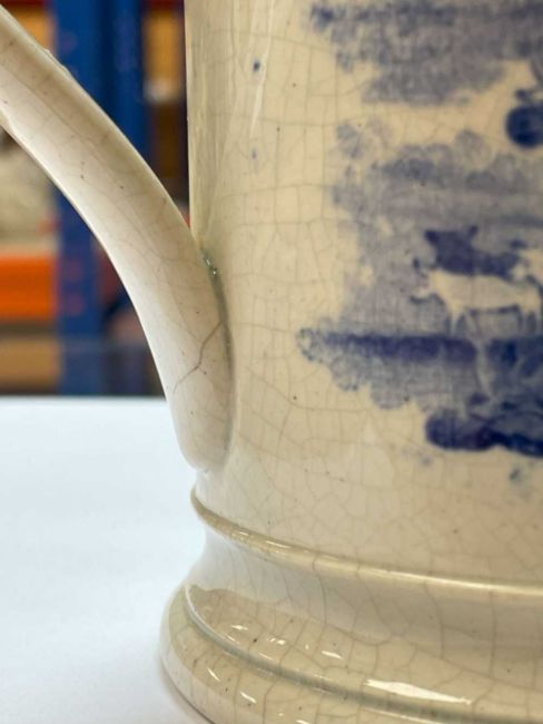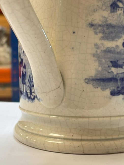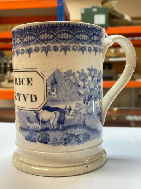 SWANSEA 'NAMED' BLUE & WHITE TANKARD printed in black with cartouche 'John Price Llanwrtyd' reserved on a pattern of cows, figures and country house landscape 12cms (h)Provenance: deceased estate NewportComments: glaze crazed, possible hairline to base of handle