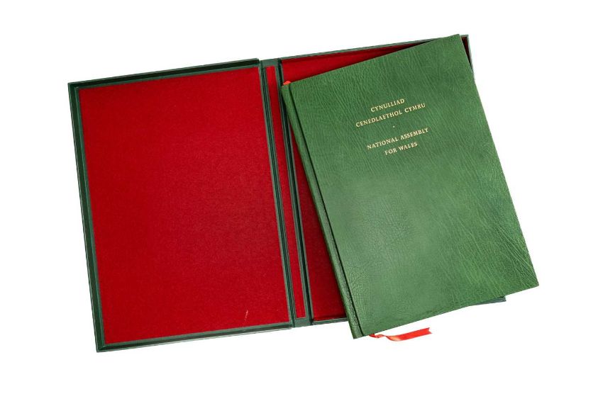 GWASG GREGYNOG PRESS: NATIONAL ASSEMBLY FOR WALES FACSIMILE-SPECIAL 1998 Gregynog commissioned souvenir limited edition (6/16) declaration of 'Government of Wales Act 1998' being a facsimile of the inaugural document which was signed by HM The Queen at the opening of the National Assembly for Wales, hand bound in green full cloth, blocked in gold and presented in a slipcase (there were specially-annotated copies available for Assembly members), signed by printer and binders David Vickers, Alan Wood and Eric Franklin, cased with accompanying ephemeraProvenance: private collection SwanseaComments: fine condition