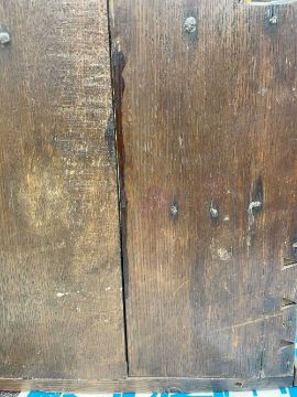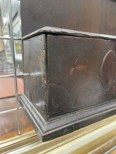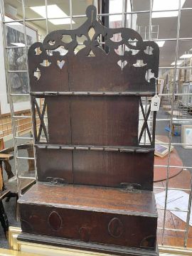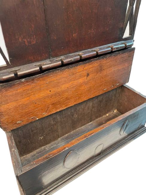 GEORGE III WELSH OAK MURAL SPOON RACK, pierced tall two-piece back applied with two lateral rails for fourteen spoons, above hinged-lid candle box, with fruitwood inlays and appliques, 103.5 (w) x 40 (d) x 123cms (h)Provenance: the Welsh art collection of award-winning television producer, the late Pat Llewellyn (1962-2017).Comments: patina and wear commensurate with age.